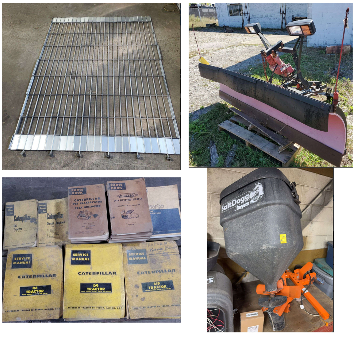 Large lot of building materials including 98 pc of 4’ x 8’ wall panels with 3/8” plywood on 2x4 studs. Slat wall panels. Large lot of suspended ceiling 12’, 2’, 4’ rails, tees and cross bars plus 2’x4’ and 2’x2’ ceiling tile and vent grids. New Metro side-folding open air door. New steel door frames and doors. New panic & fire door hardware. Wood solid core doors in various sizes. Large lot of rolls of plastic sheeting. Western Snow plow 90” w/poly blade. 2 Salt Dog salt spreaders. Walk-behind 32” brush-hog mower. Over 100 heavy equip. new & reconditioned air filters. Heavy Equip. Repair Manuals. Large lots of building contractor hand tools and building supplies. Portable gas powered irrigation system w/500’ hose. Budgit A-Frame, Mobile Gantry, model# 502076, 3 ton HD manual chain hoist. (2) Weather Guard tool organizing bins for cargo vans. Large lot of assorted water and pump hose.