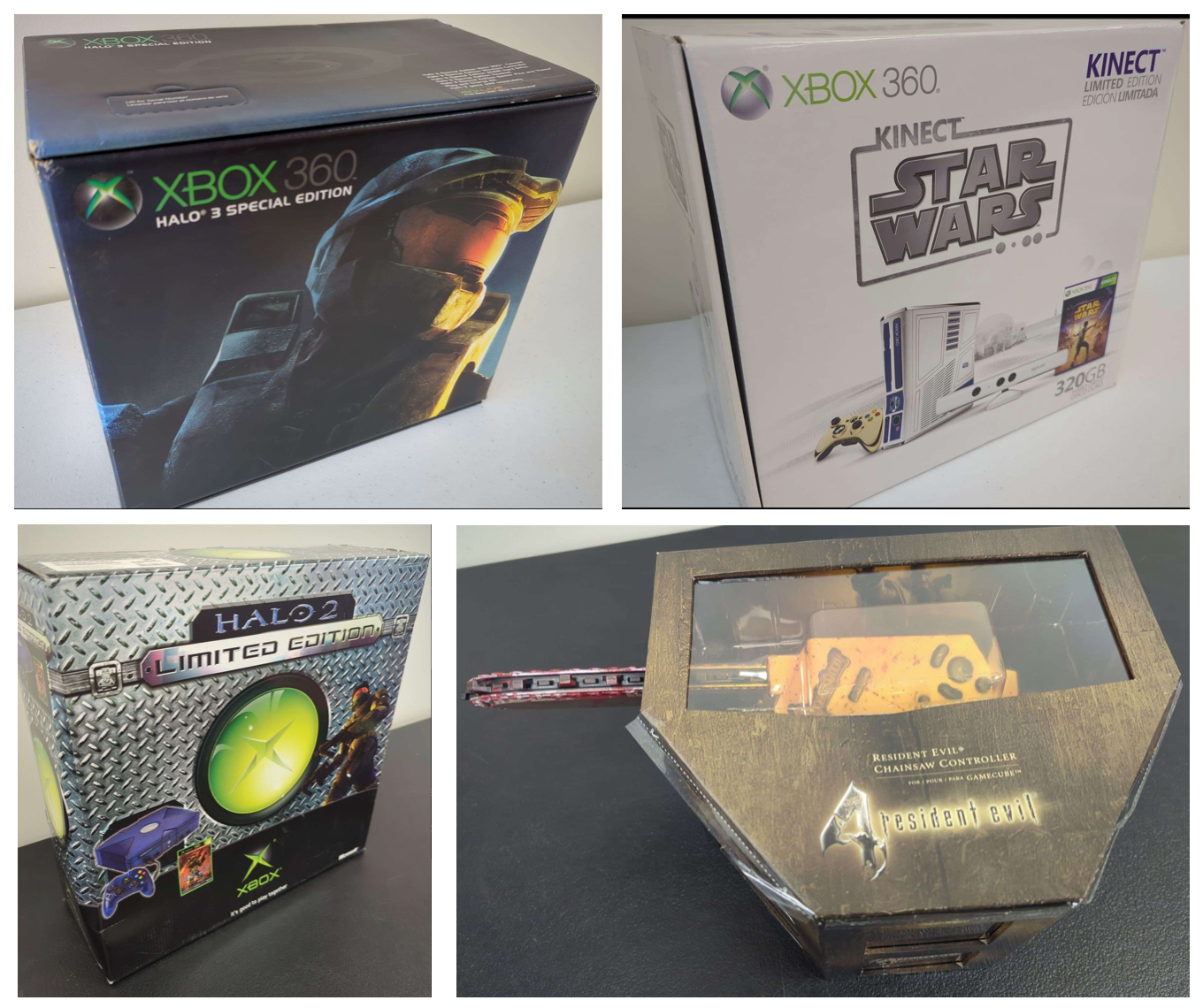 Sealed Limited Edition software bundles for XBOX and Play Station, Rare X-Box Limited Edition controllers including Halo, Gears of War, and Sea of Thieves. Ultra Rare Resident Evil chainsaw controllers for PS2 and Gamecube. So much more!