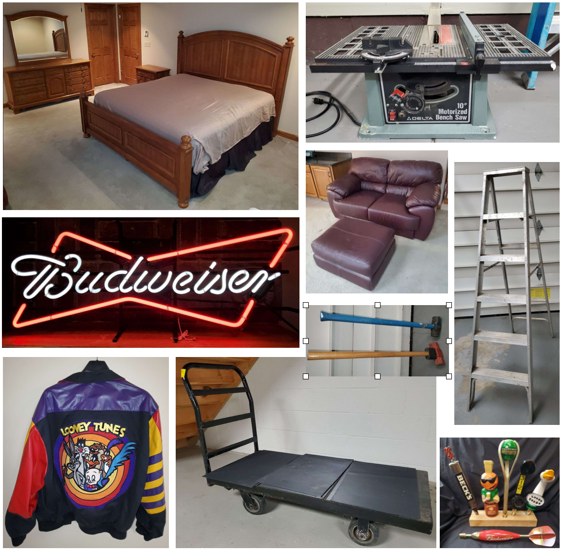 Auction includes quality living room, dining room, & bedroom furniture, household goods, collectibles including neon or other beer signs, NASCAR collectibles, other decor items, lawn and garden tools, hand and power tools, ladders, heavy punching bag, wall mounted 200# cap weight machine and much more